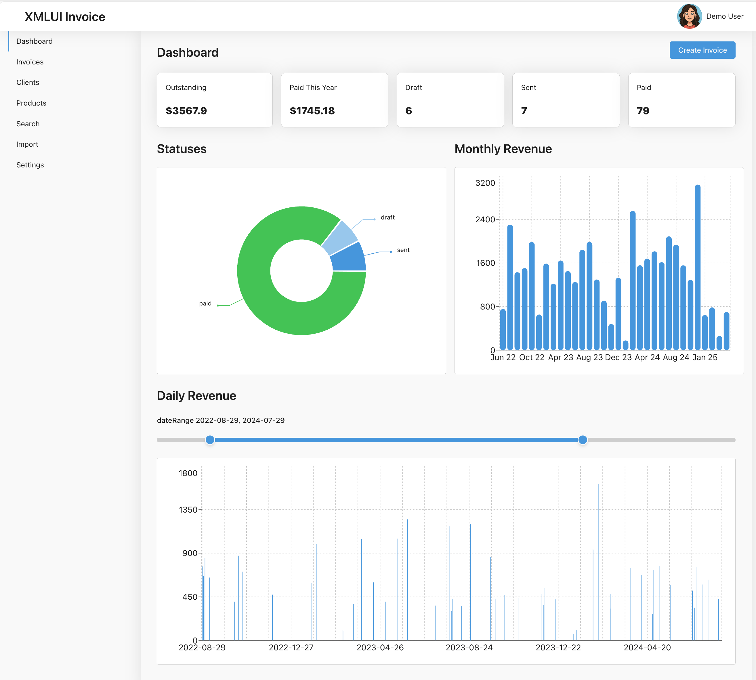 XMLUI Invoice is a demo app that illustrates a range of XMLUI components and patterns. You can